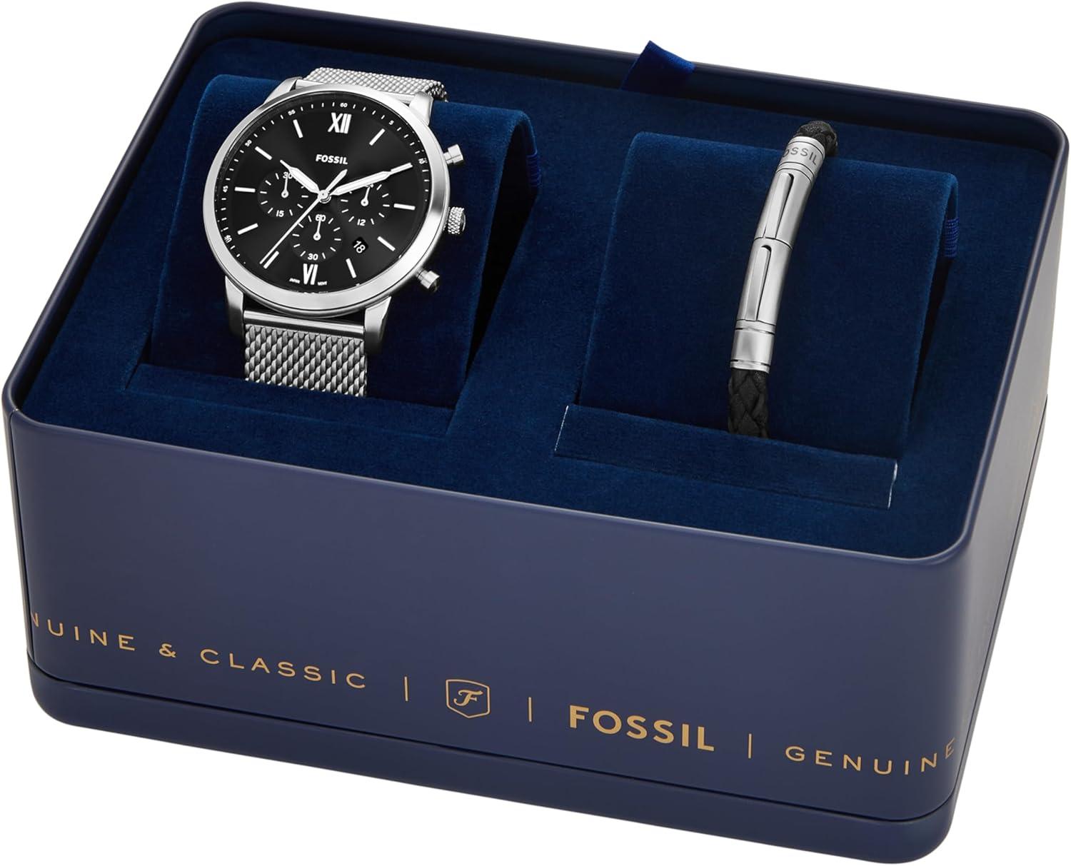 Fossil Men’s Neutra Quartz Stainless Steel and Leather Chronograph Watch(Silver Mesh Gift Set)